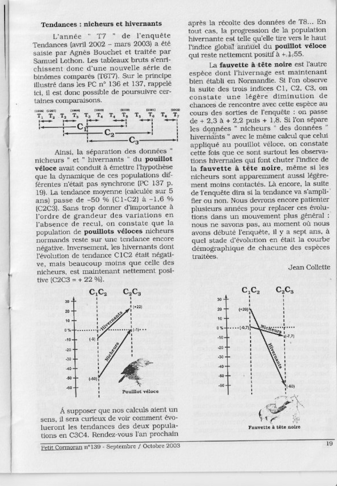 Un autre essai d'utilisation des données de l'enquête Tendances : pour une espèce donnée présente toute l'année bien qu'une partie (ou la totalité) des individus soient renouvelée au cours des saisons, la tendance démographique est-elle la même? Un pouillot nicheur normand a t-il le même calendrier démographique que l'hivernant venu des Pays baltes qui le remplace dans la ripisylve? Il est bien sûr très prématuré de répondre à une telle question avec aussi peu de recul! Mais c'est par contre l'occasion de provoquer la curiosité des participants pour "entretenir la flamme". C'est aussi l'occasion de remercier Samuel et Agnès qui m'ont bien épaulé durant ces premières années de fonctionnement en saisissant les données envoyées par les participants.