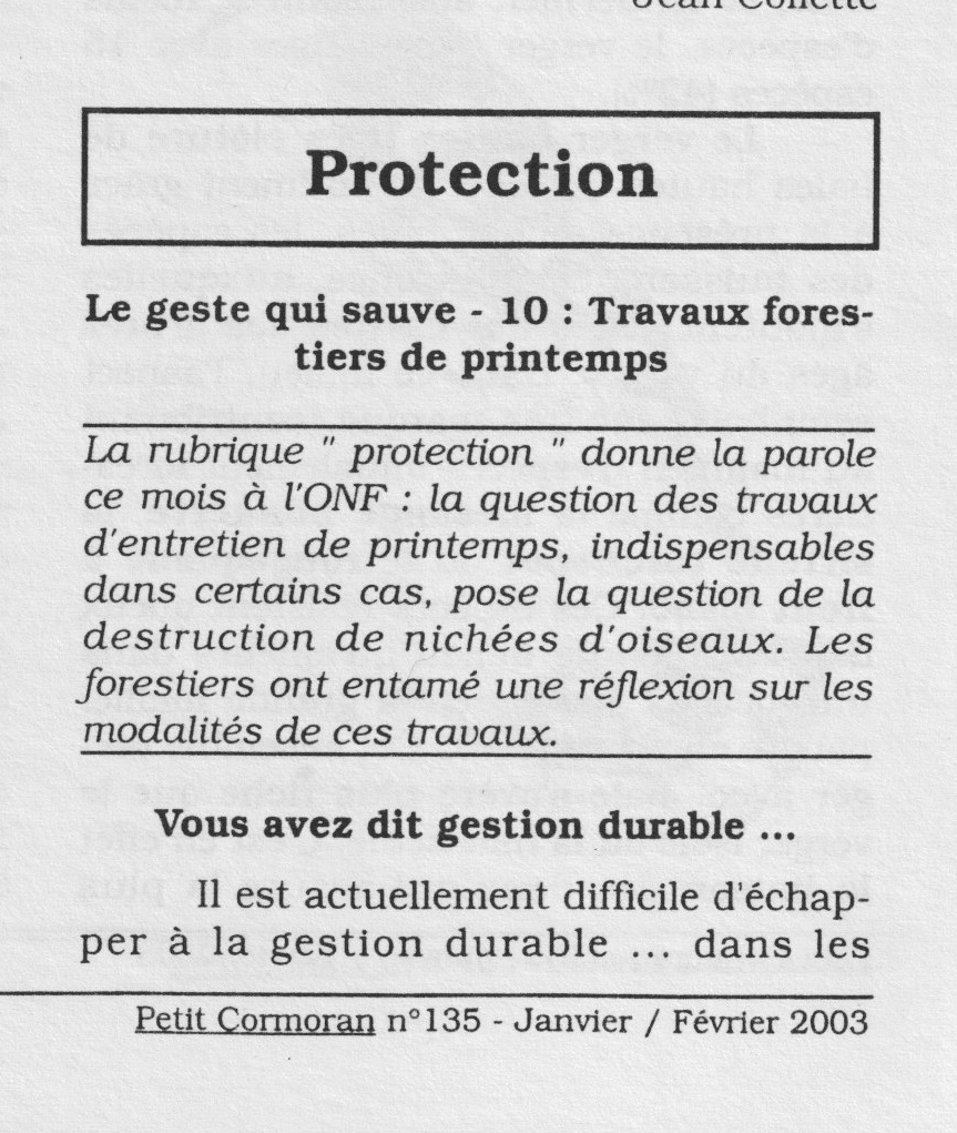 A partir de 2001, une rubrique plus ou moins régulière rapporte des témoignages ou des expériences en lien avec la protection des oiseaux ou des habitats. Cette expérience durera dans le temps avec tout le succès de nidification attendu en contrepartie de chantiers d'entretien répétés sous la houlette de Christian Gérard, conservateur de la réserve qu'il faut remercier ici, de même que tous les bénévoles et salariés dont Céline Chartier, qui ont participé à ces travaux d'aménagement. Thierry Lefèvre motive depuis longtemps les adhérents du GONm pour la pose de nichoirs destinés aux rapaces dont il est certainement l'acteur le plus actif. Il gère aussi le fichier des résultats. La question de la lutte antiparasitaire du bétail est probablement une cause majeure de disparition de nombreuses espèces liées aux gros insectes (bousiers) de même que celle du comblement des mares (dytiques, libellules et autres) : pie-grièche, chevêche, huppe,...