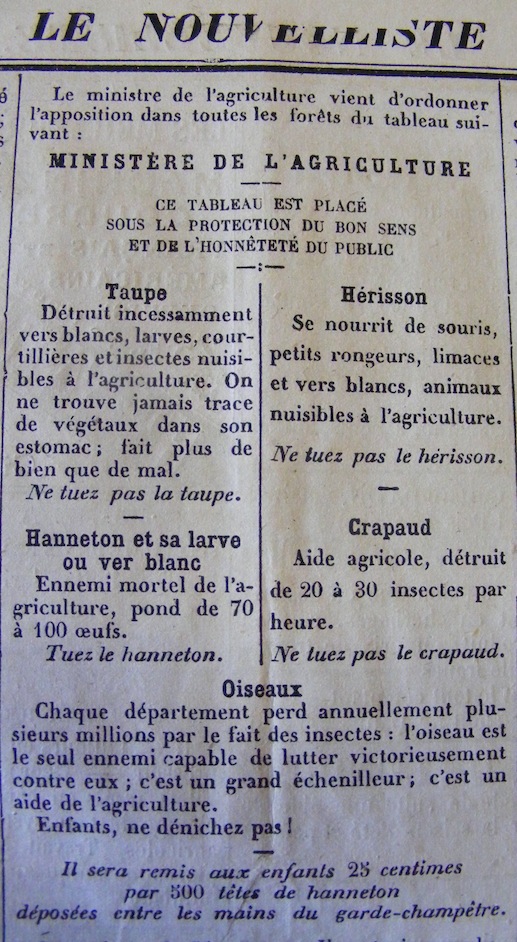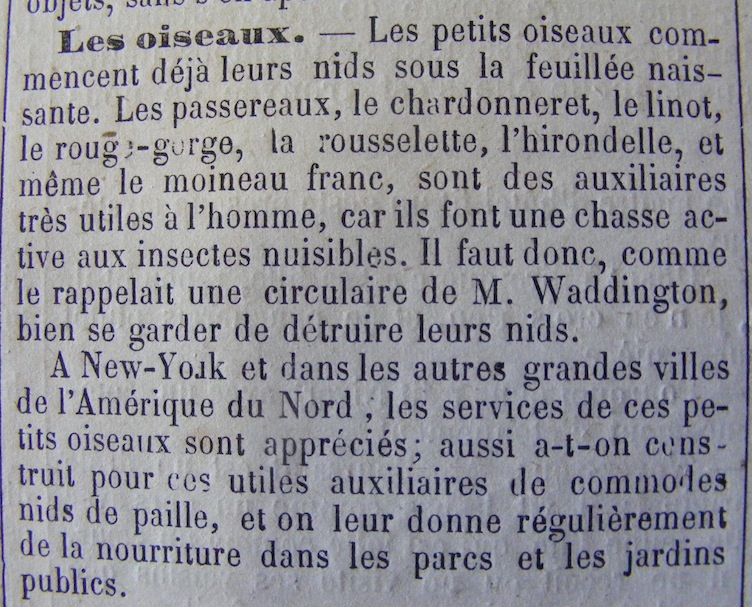 Le Nouvelliste est un journal (républicain) de l'arrondissement d'Avranches (1875-1944). Entre deux pages de chroniques politiques et de publicité, notes et faits divers rapportent tout et n'importe quoi, histoires de fantômes et crimes crapuleux... Quelquefois, une note s'intéresse à la nature. Les sujets rappellent que l'éducation en cette fin de 19e est une préoccupation permanente. Aussi bien le nourrissage hivernal que la pose de nichoirs donnent matière à réflexion. Nous venons de là avec nos préoccupations de 2015...