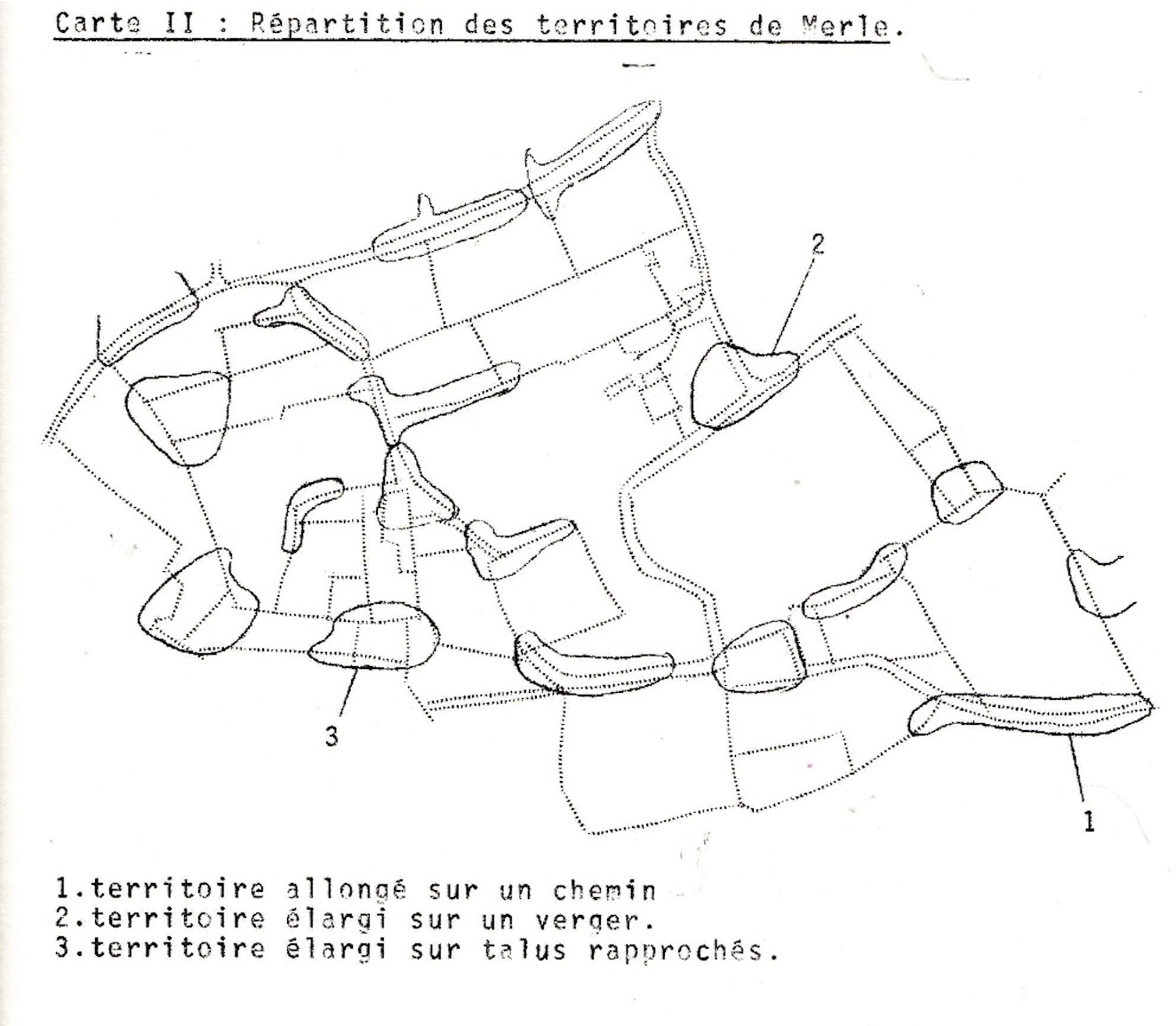 Sur les 20 ha du quadrat étudié avant et après remembrement, le maillage de talus boisés perd 4,2 km, soit 66 % de la longueur initiale. La population de passereaux perd 61 % de ses couples nicheurs. Le merle choisi ici comme exemple, passe de 17 couples à 8 soit une régression de 53 %. On constate sur les deux cartes le rôle majeur joué par les chemins, doubles haies parfois assez denses pour mimer des taillis allongés, "bandes boisées" dont on souhaiterait que le bocage squelettique actuel conserve au moins l'armature de couloirs de circulation des espèces sauvages.