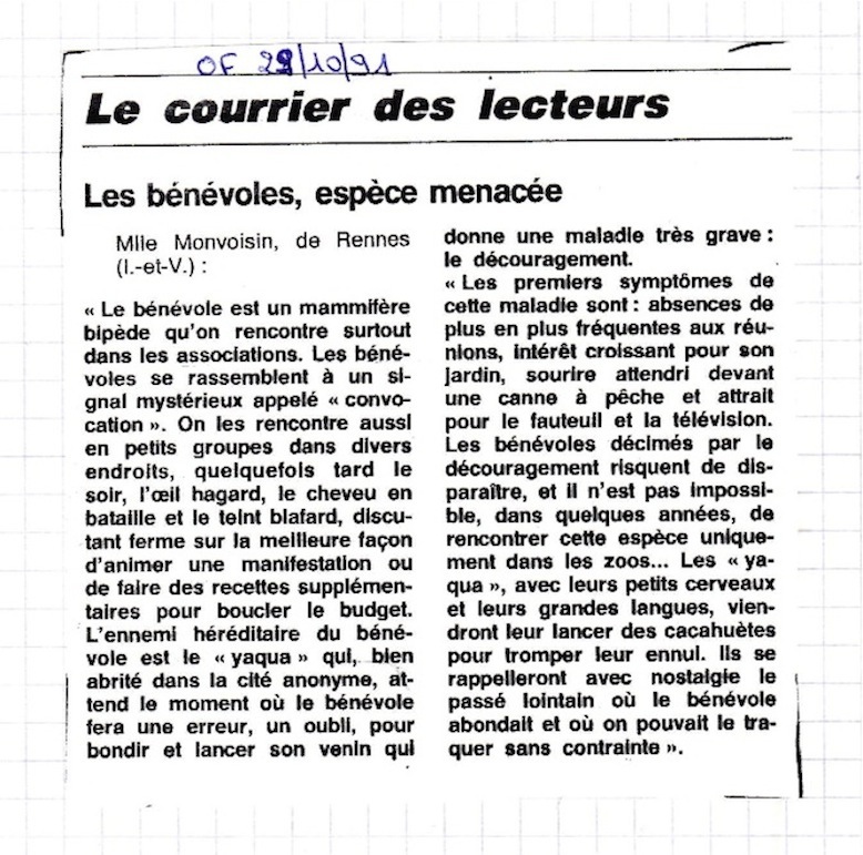 Retrouvé en feuilletant un cahier de notes cet extrait du courrier des lecteurs d'Ouest-France. Le thème n'est pas nouveau et vaut toujours en 2016. Un peu d'humour ne fait pas de mal...FauKon et YaKa même antidote : "C'est celui qui dit qui y est". Le GONm vit sur la mobilisation d'un grand nombre de ses adhérents lors des grandes enquêtes (mais pas seulement) et au jour le jour sur l'engagement complet de quelques administrateurs élus pour 2 ans (souvent renouvelables...) et de quelques adhérents "spécialisés" dans un domaine particulier. Mais le terreau de notre vitalité reste le nombre d'heures d'observation sur le terrain fournissant une masse de données dont auraient rêvé les naturalistes du 19e siècle (et nous aussi à la lecture de leurs listes souvent pauvres en commentaires...)