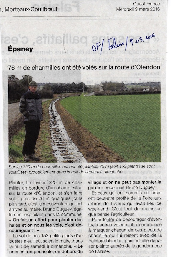 A noter : un plant tous les 50 cm, bel avenir. Dans certains cas exemplaires, c'est un plant tous les mètres, mais sur deux rangs, à la façon des anciennes haies "de pied" du Pays d'Auge.