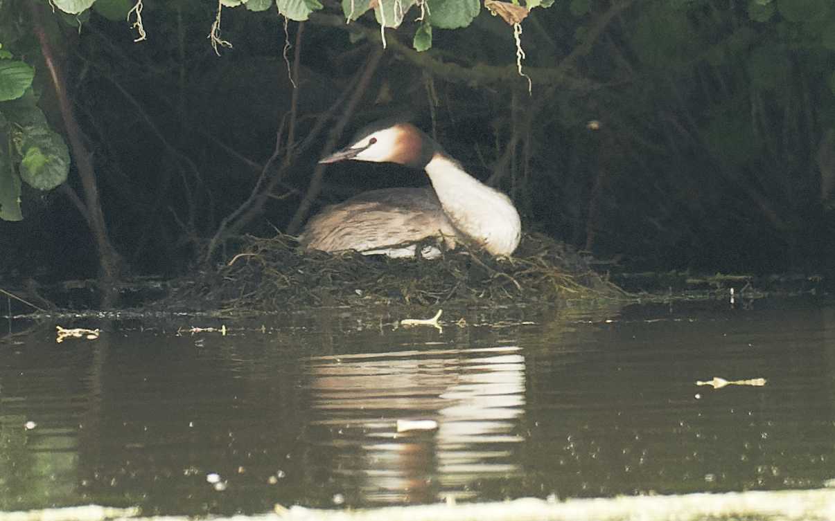 Le 14 mai un couple de grèbes huppés se promène sur le plan d'eau. J'aperçois un des deux grèbes qui s'installe dans un nid de foulque récemment construit. Très peu de temps après le foulque "propriétaire" du nid se précipite vers le nid en courant sur l'eau. Le grèbe s'enfuit aussitôt en se mettant aussi à courir sur l'eau, le foulque le poursuit pendant une dizaine de secondes, mais le grèbe court plus vite que lui. Deux minutes plus tard les deux grèbes se retrouvent et paradent tranquillement. Le 30 juin j'aperçois un grèbe dans un nid de foulque, avec un oeuf présent dans le nid. Le nid de foulque se reconnaît facilement, il est assez haut et caché sous les branches basses d'un arbre. Je repasse après plus d'une heure, le grèbe est toujours présent. Comment cette couvée va-t-elle finir ? Les foulques vont-ils réussiront-ils à récupérer leur nid ? La suite au prochain épisode.