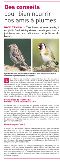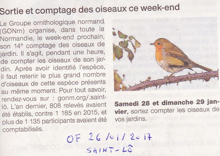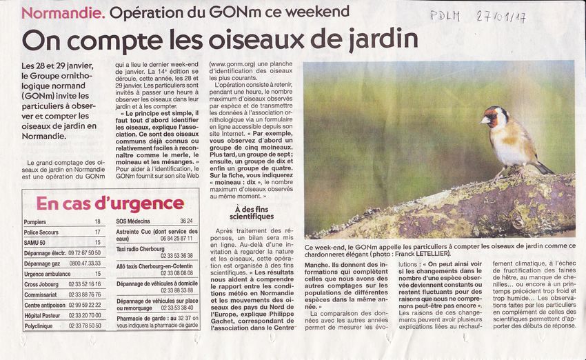 Quatrième article post-grand comptage des oiseaux de jardins. Le rédacteur s'est rendu au refuge de Jocelyn Desmares non loin de Picauville/50 pour assister au comptage. L'article est complet et utilise toutes les sources possibles émanant du GONm ou de la LPO organisatrice au niveau national. Un bémol, la légende négative sur l'étourneau qui peut surprendre mais est un peu hors sujet.