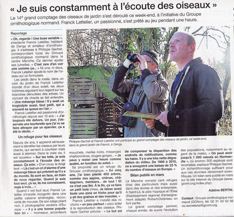 Deux articles de presse après le grand comptage : l'un qui suit une action organisée avec les éléves de 6ème d'un collège de Mortain et l'autre, qui tout en étant dans le sujet, profite de l'occasion pour faire un portrait de Franck, collègue ornitho du GONm et photographe et pour présenter son refuge GONm.