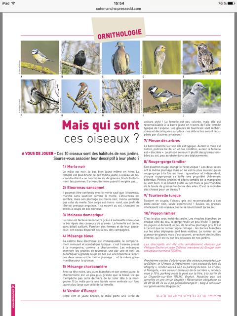 Suite à une communication autour du grand comptage des oiseaux de jardin, le GONm a répondu à une commande de la part de l'hebdomadaire gratuit Côté Manche. Quelques photos et quelques textes descriptifs d'espèces communes des jardins ont donné naissance à ce jeu de quizz. Quelques principes pour nourrir les oiseaux ont également été communiqués et retranscrits dans l'article suivant.