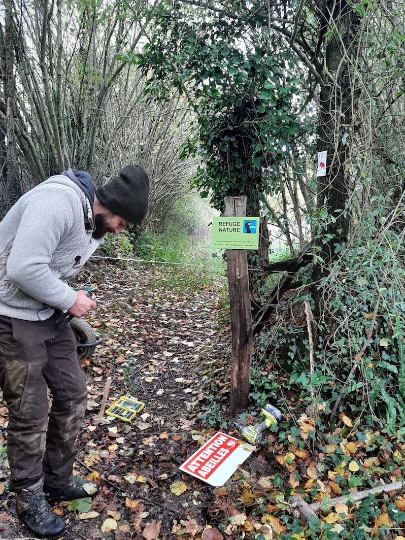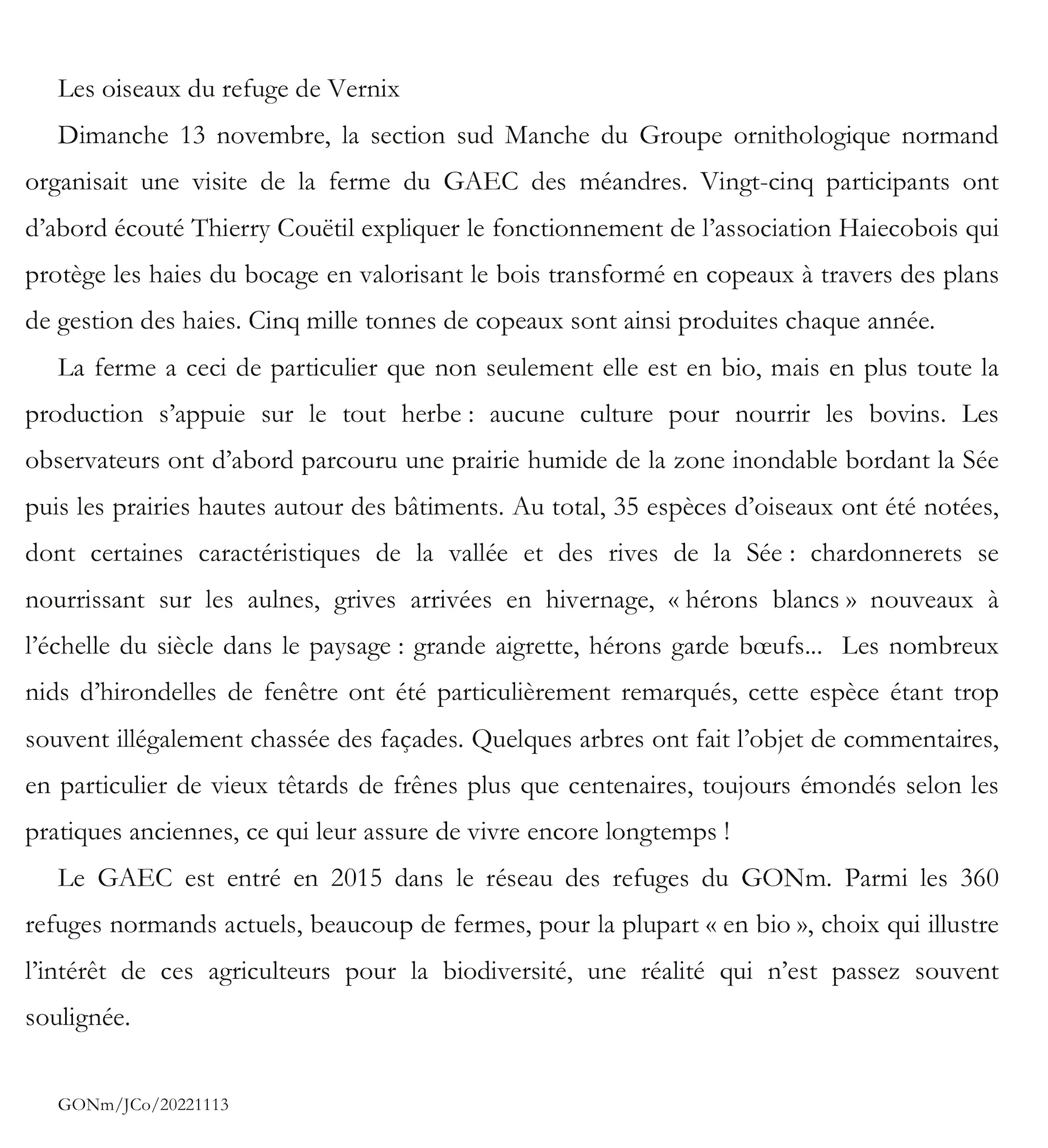 Maraichers bio, Maxime Gallais et Catty Ledrait ont souhaité entrer dans le réseau des refuges du GONm. Il fallait un correspondant : notre collègue Jérôme Degoulet est venu en voisin et il était normal que la signature soit officialisée par voie de presse locale en présence de Philippe Gachet, administrateur du GONm. Ce fut fait mercredi 23 novembre, occasion de visiter le refuge. Beau chemin creux, belles haies de plus de 5m de large, une parcelle laissée en évolution naturelle, un verger en devenir, les habitats devraient accueillir une belle population de passereaux. Le bouvreuil, le roitelet à triple bandeau sont déjà là. Le cantonnement de fauvettes sera remarquable!