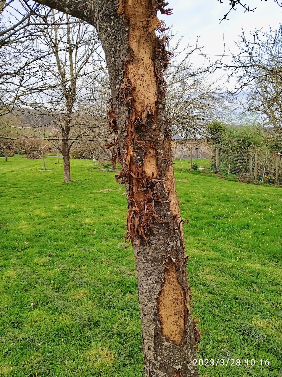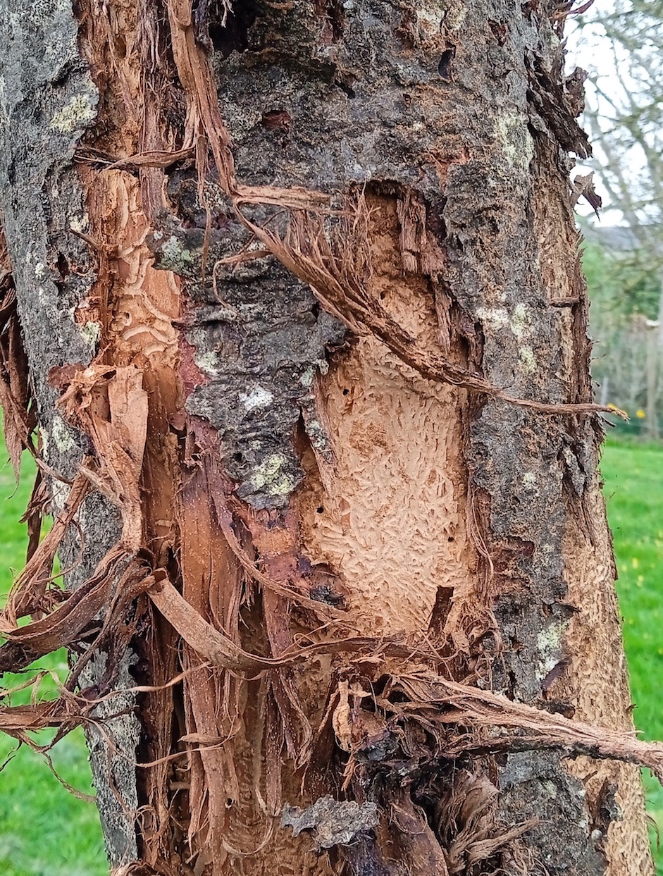 Il faut croire que le pic a été déçu et s'est défoulé sur le vieux pommier mort... L'écorce est en charpie mettant à nu les galeries des larves xylophages.