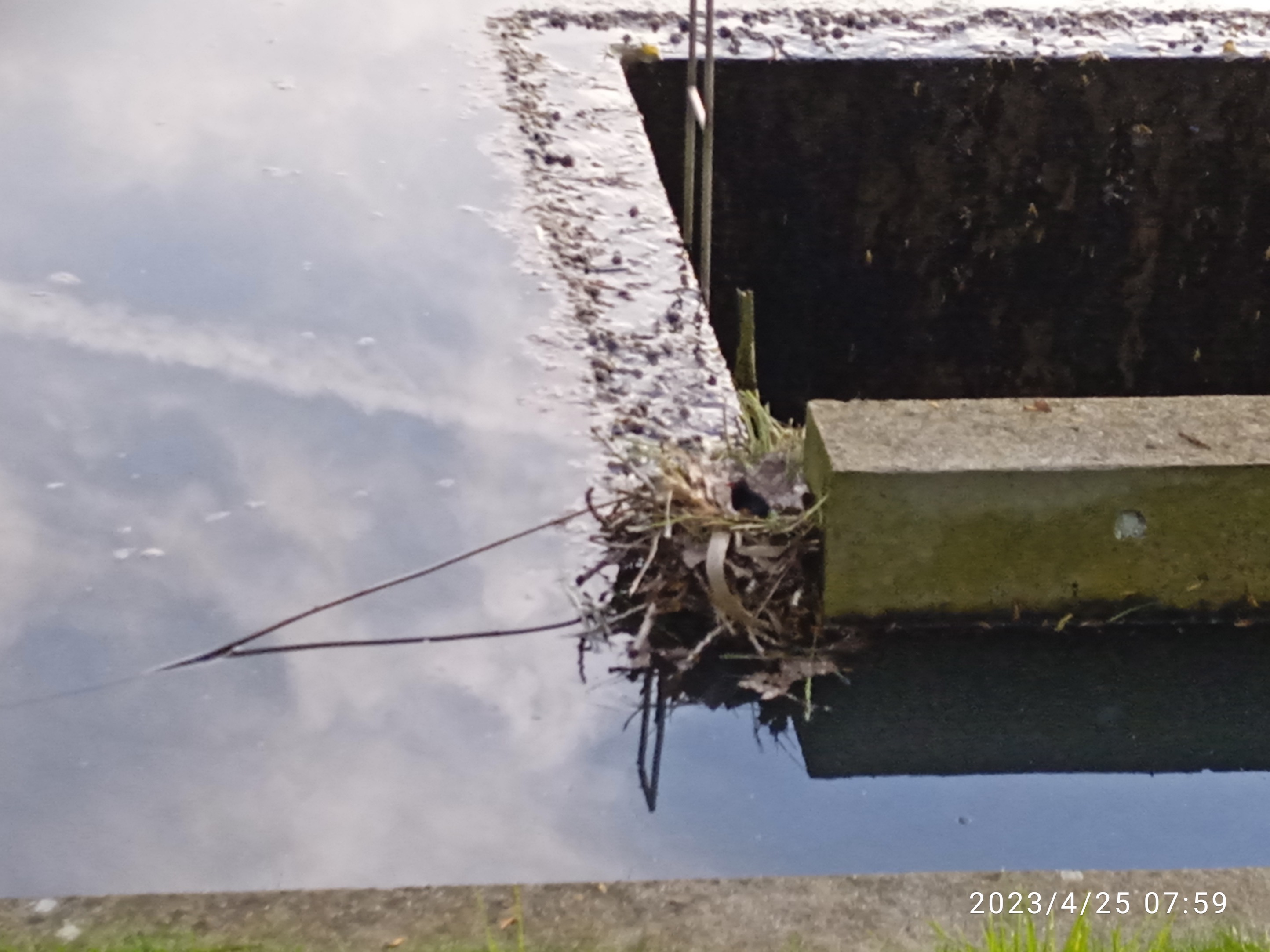 Sur un bassin assez nu, la poule d'eau a construit un "mini nid" très exposé... Il reste un poussin de poule d'eau hier, il y a peu de chances qu'il soit encore là dans quelques jours vu le coup d'oeil plongeant des corneilles locales! Lors du dernier relevé, une "épave" intrigante : un oeuf de chouette hulotte prédaté, perdu au sol. Les dimensions (49x40) et les stries décrites par Géroudet collent bien avec cette espèce. Pour déterminer le prédateur, juste l'écartement des deux canines, 23 mm. Astuce pour manipuler et conserver les coquilles vides, les remplir de paraffine en fondant de la bougie. Un peu plus tard, le 20 juin, même découverte (oeuf 46x41; écartement canines : 15)