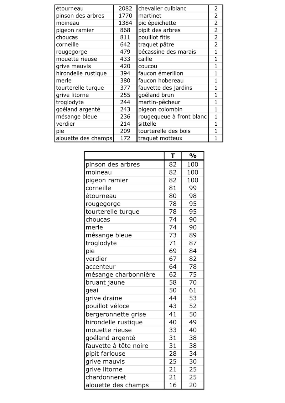 Effectifs comptés depuis juillet 2002: maxi et mini; Les premières espèces par constance.