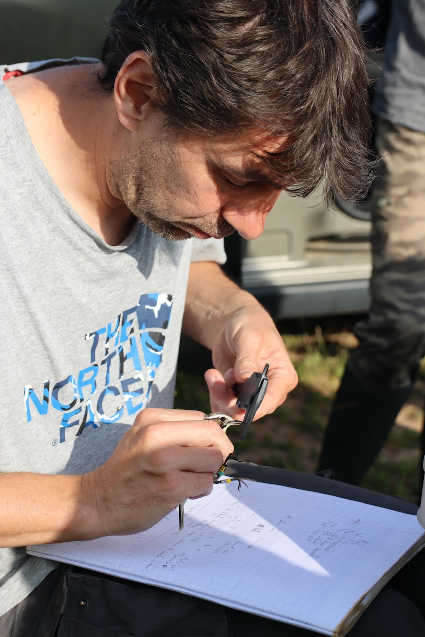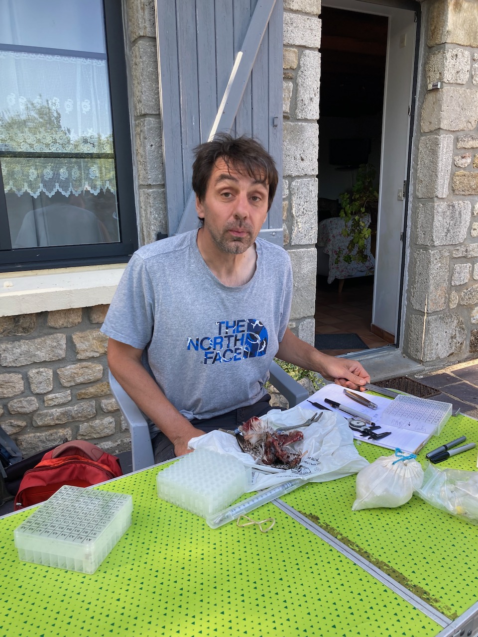 Durant 2 journées, présence de Jérome FUCHS, maitre de conférence au MNHN venu faire des prélèvements de sang sur 2 traquets tariers. Il travaille sur la phylogénie et la phylogéographie des oiseaux. Il avait besoin de prélèvements de sang sur cette espèce et sur la bergeronnette flavéole (sur 2 individus de chaque espèce). Si le nombre de tariers capturés a permis d'y parvenir facilement, les flavéoles, comme à leurs habitudes à cette époque, n'ont pas daigné se faire prendre. La récupération du jeune courlis tué par le busard des roseaux a fait aussi l'objet de mesures précises et prélèvement de chair. Contrat rempli à moitié, Jérome reviendra en juillet ou août durant le prochain stage pour la flavéole.