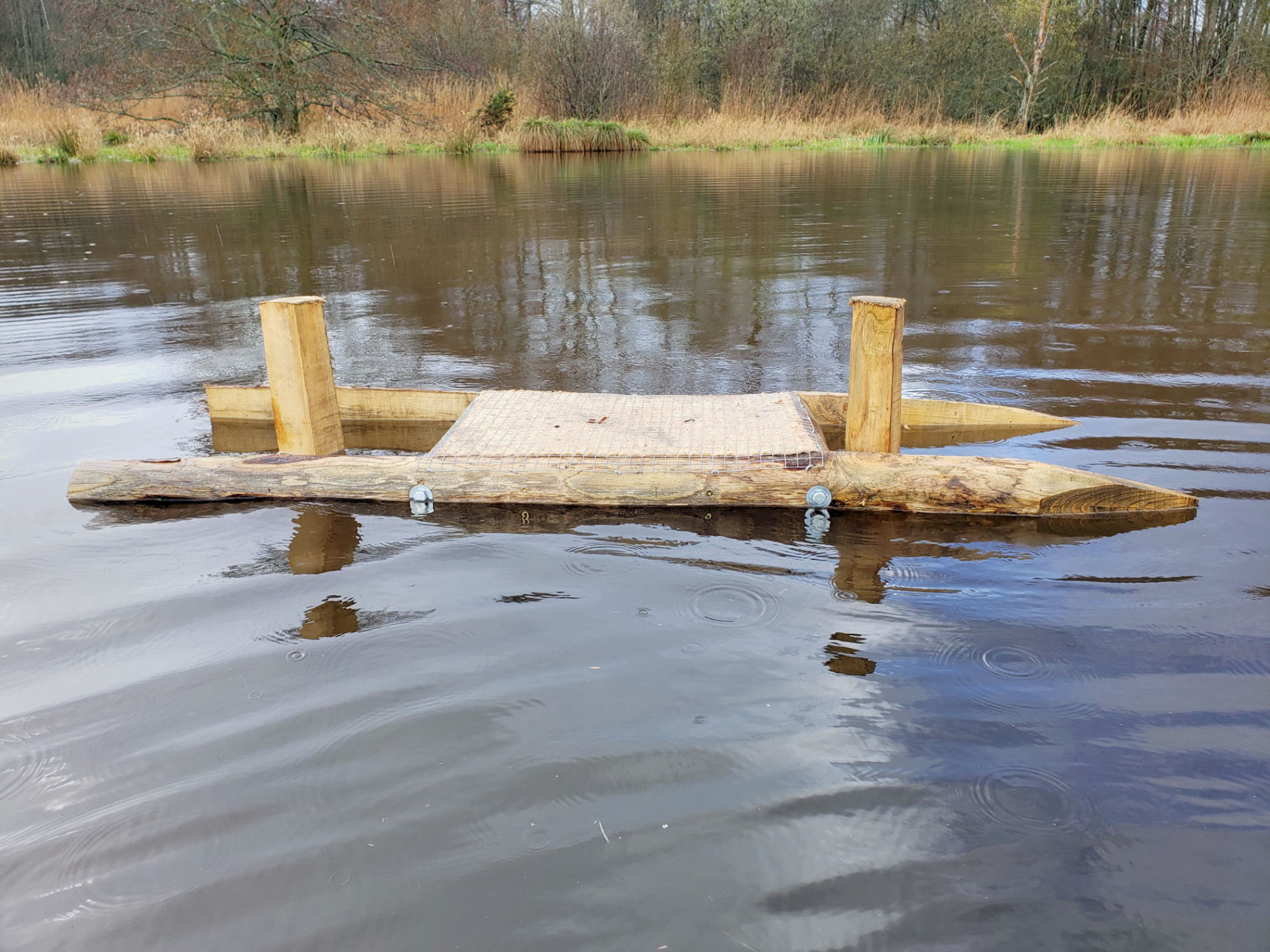 Pour la réalisation de ces radeaux j’ai utilisé de simples piquets de châtaignier (imputrescibles), une plaque de polystyrène extrudé en guise de flotteur, du grillage et du chanvre pour la protection et l’habillage.