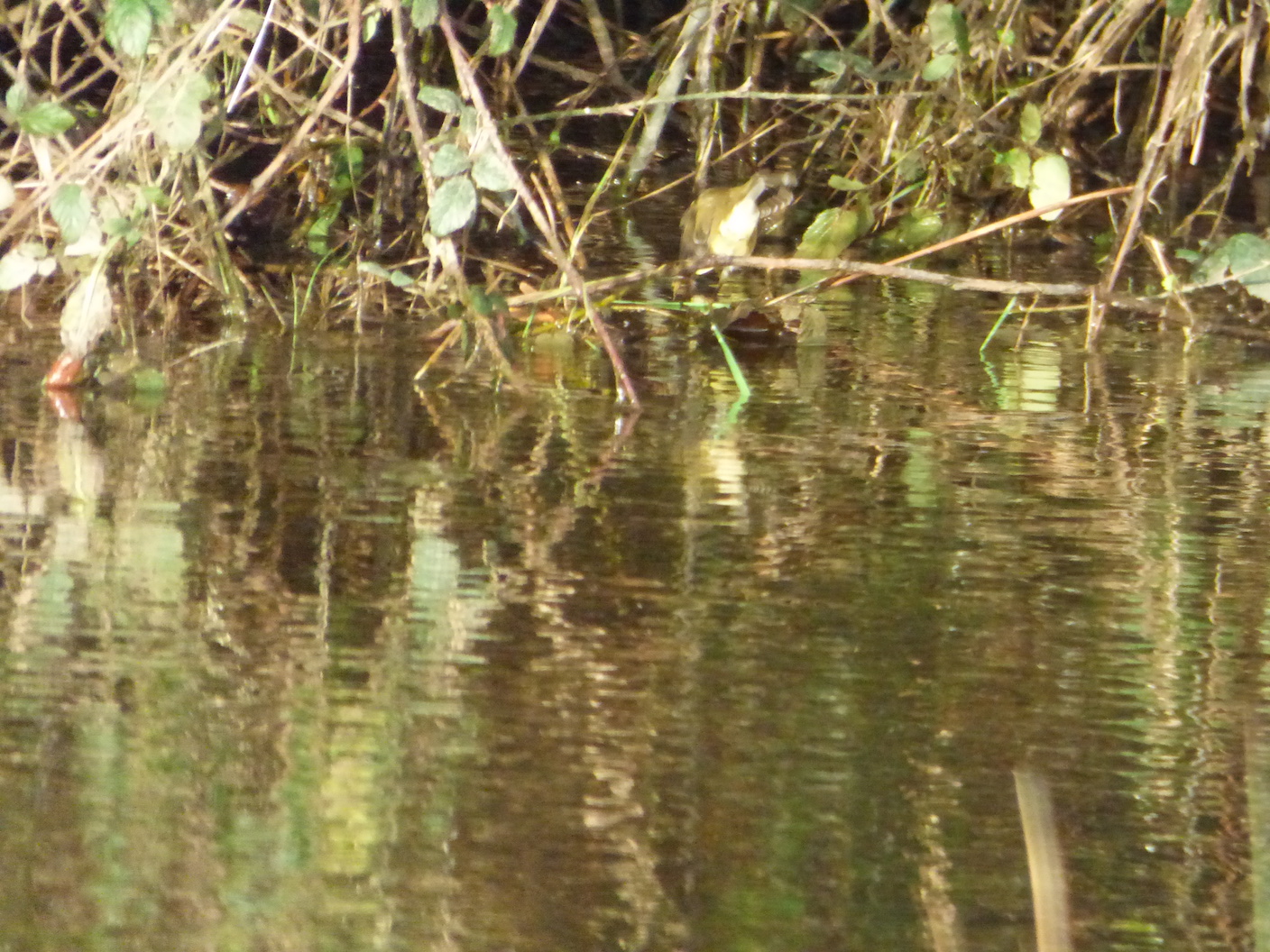 Les 4 clichés qui suivent concernent la haie perpendiculaire au flot de crue : le roncier bloque partiellement l'eau, des débris de végétation sont arrêtés, visibles ici parce que le niveau a légèrement baissé.