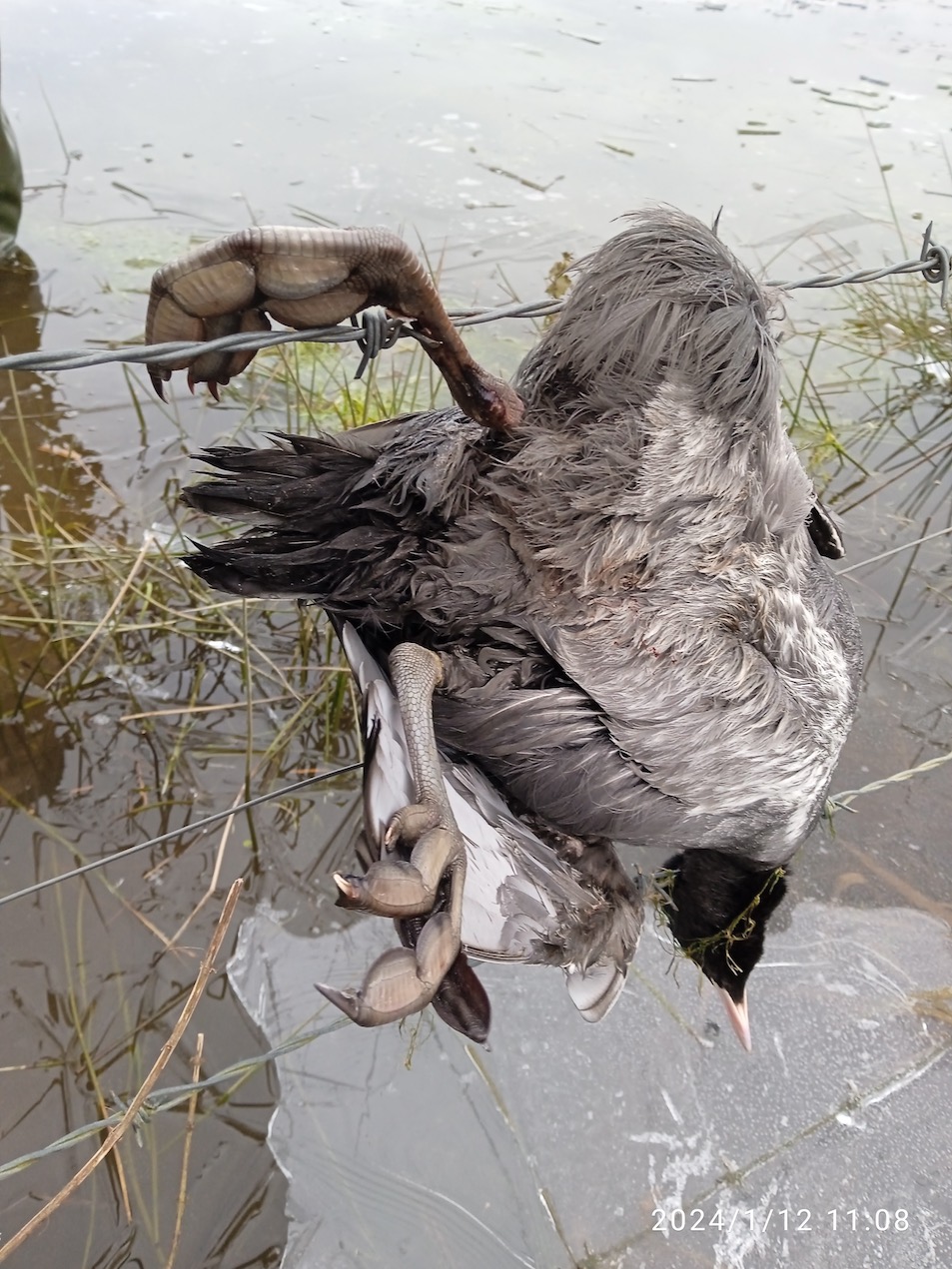 Ce matin, en compagnie de Paulo Sanson et Pierre Cudelou, comptage WI sur la réserve. Au loin, tache noire sur la clôture en bordure du gabion... Cadavre récent de foulque accrochée par l'aile à la pointe d'un barbelé de la clôture. Le niveau d'eau de l'inondation a peut-être atteint la hauteur de ce 3e fil de la clôture?