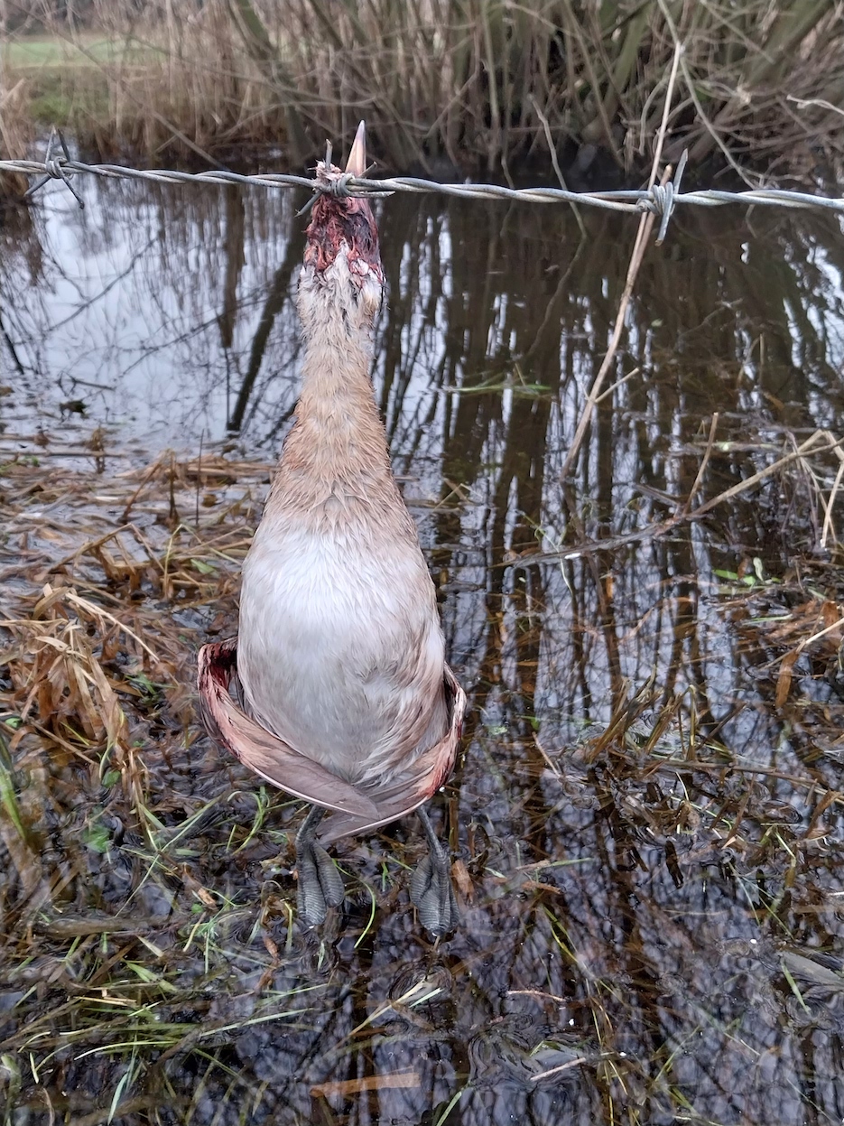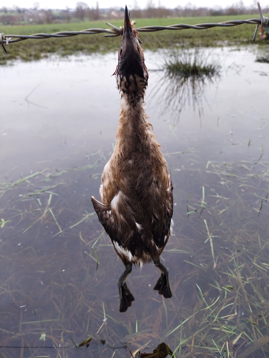 L'an dernier, à peu près dans le même secteur, Paulo a photographié un cadavre frais de grèbe huppé, empalé par le bec sur le même type de barbelé.(Reliquat d'inondation, mais à un niveau qui n'expliquerait pas la "collision" d'un oiseau nageant.)