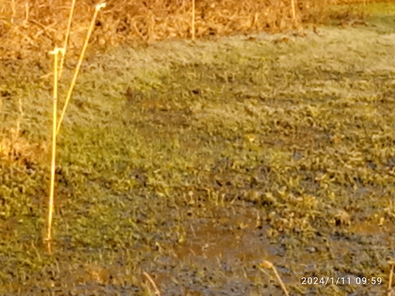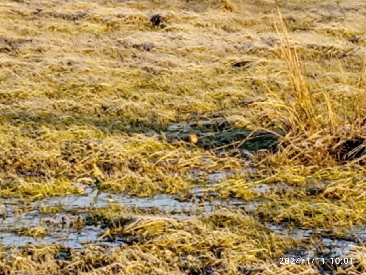 Autre observation locale en rapport avec l'inondation, l'îlot central mené en exclos, sauf en fin d'automne où il a été piétiné par les boeufs, est suivi irrégulièrement. Le 6 janvier dernier, 26 bécassines sont levées, dont 21 sur la partie occupée par les joncs, contre 2 sur baldingère piétinée. Pas de conclusion hâtive, c'est le contraire en d'autres circonstances en dehors des fortes crues. Le 11 janvier, l'inondation est en net recul mais la prairie mouillée est plutôt gelée (-4°C à 7h); au moins 11 pouillots véloces sont comptés, sur ripisylve et haie "en travers". Certains individus chassent posés sur la prairie; l'un est même à 10 m de la haie! Mauvaises photos au téléphone...
