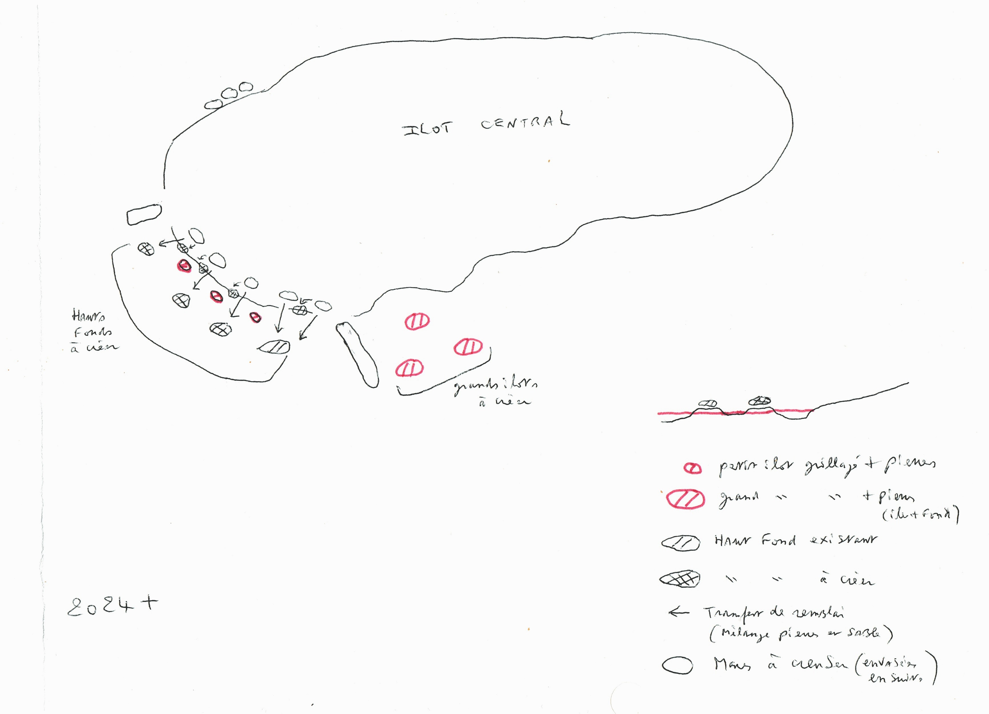 pierres) pour former plusieurs hauts fonds. sur la zone moins abritée du vent d'autres microilots plus grands avec grillage seront réalisés. tout cela prends du temps mais au fil des ans les contours se précisent !