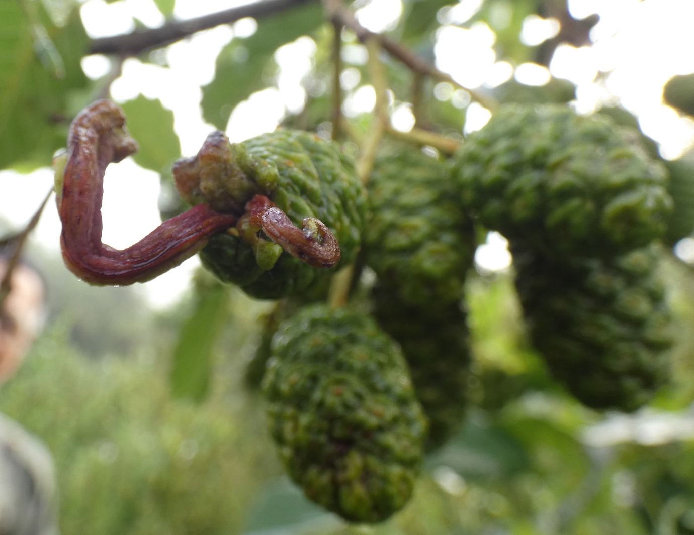 Cette galle présente sur les fruits (=strobiles) de l'aulne dans la ripisylve de la Sée avait déjà été notée sur les aulnes de la réserve immédiatement en amont (Le Montier)... en 1992. A l'époque, Michel Saussey pourtant grand connaisseur des galles normandes, avait demandé l'aide de ses collègues universitaires Rioult et Doguet pour confirmer la détermination : cette "langue rouge" s'échappant du strobile est due au développement d'un champignon Taphrina amentorum connu d'après la littérature sur l'aulne blanc, surtout en montagne. La galle fut observée deux années de suite sur les mêmes pieds d'aulne de la réserve du Montier (étés 1992 et 1993).