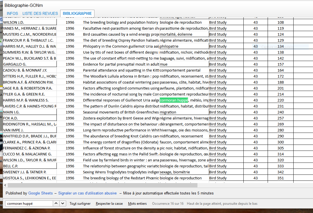 A ce jour, vous pouvez consulter les sommaires des revues suivantes : Alauda et Ornithos (revues nationales en français)