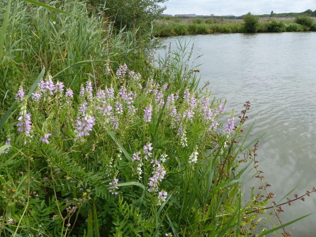 L'îlot de la Prairie a été aménagé pour l'accueil de l'avifaune, cependant il convient de le laisser au stade pionnier pour que les espèces recherchées y trouvent refuge. Hélas suite à un aménagement malheureux dans les années 80, le Galéga a été planté et il prospère ces dernières années. Seulement 100g de matière sèche peuvent tuer une brebis ! La plante a colonisé l'îlot et l'arrachage manuel est de rigueur. Photos Avant/après l'arrachage et du Galéga.
