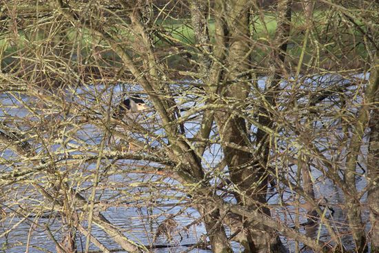 Ayant observé ce bihoreau hier sur un secteur inondé de la vallée de la Vire, je n'avais pu le photographier. Alain Brodin est allé faire un tour ce matin et a trouvé l'oiseau au même endroit qu'hier. Bien sûr, la photo n'est pas évidente parce que l'oiseau est perché bien à l'abri derrière la profusion de branches de la ripisylve. Le contraste accentué de son plumage le rend malgré tout bien visible de loin. Sur l'image, on voit bien la calotte et le dos noirs ainsi que le rouge de l'oeil. Merci à Alain d'avoir fait un déplacement perturbé pour réaliser cette image!